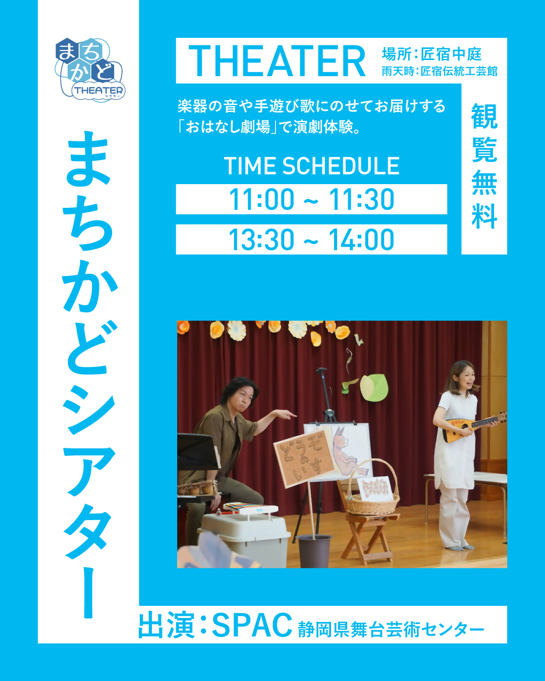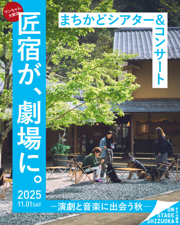 匠宿が、この秋一日だけの劇場に。SPACがお届けする「まちかどシアター」と、富士山静岡交響楽団が奏でる「まちかどコンサート」。静岡市のまちづくり、「まちは劇場」の2つのイベントが匠宿に初登場します。