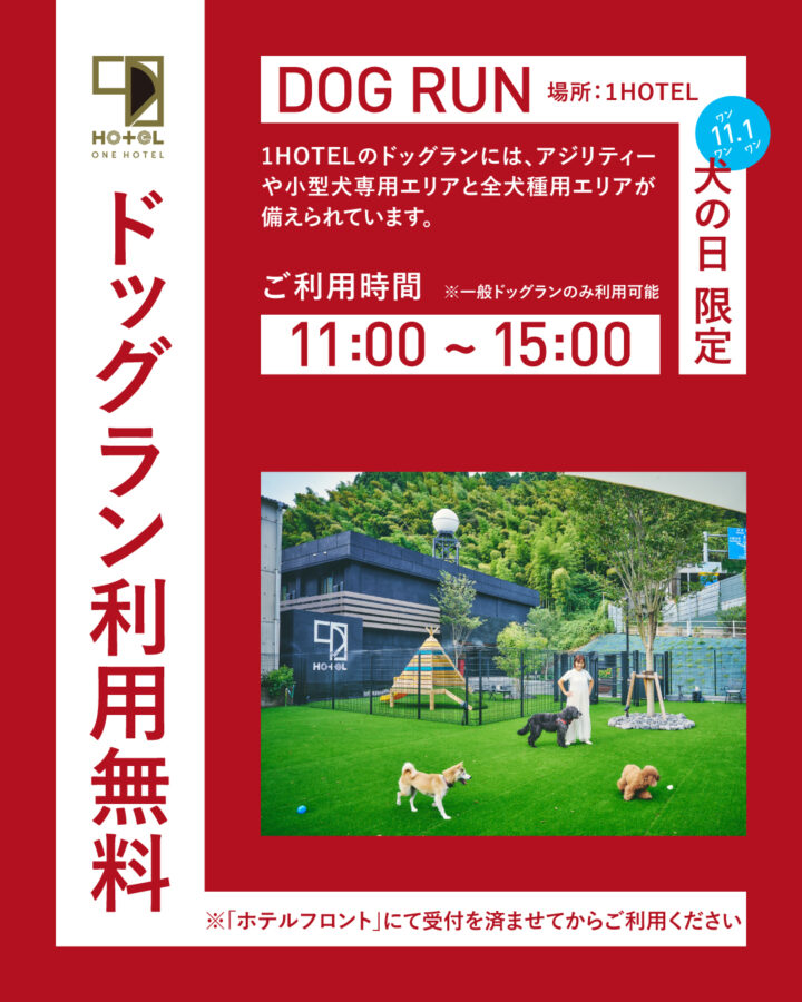 11月1日、ワンワンワンとかけましてこの日限定で1HOTELドッグランを無料開放いたします。芸術の秋をぜひワンちゃんと匠宿でお楽しみくださいませ。